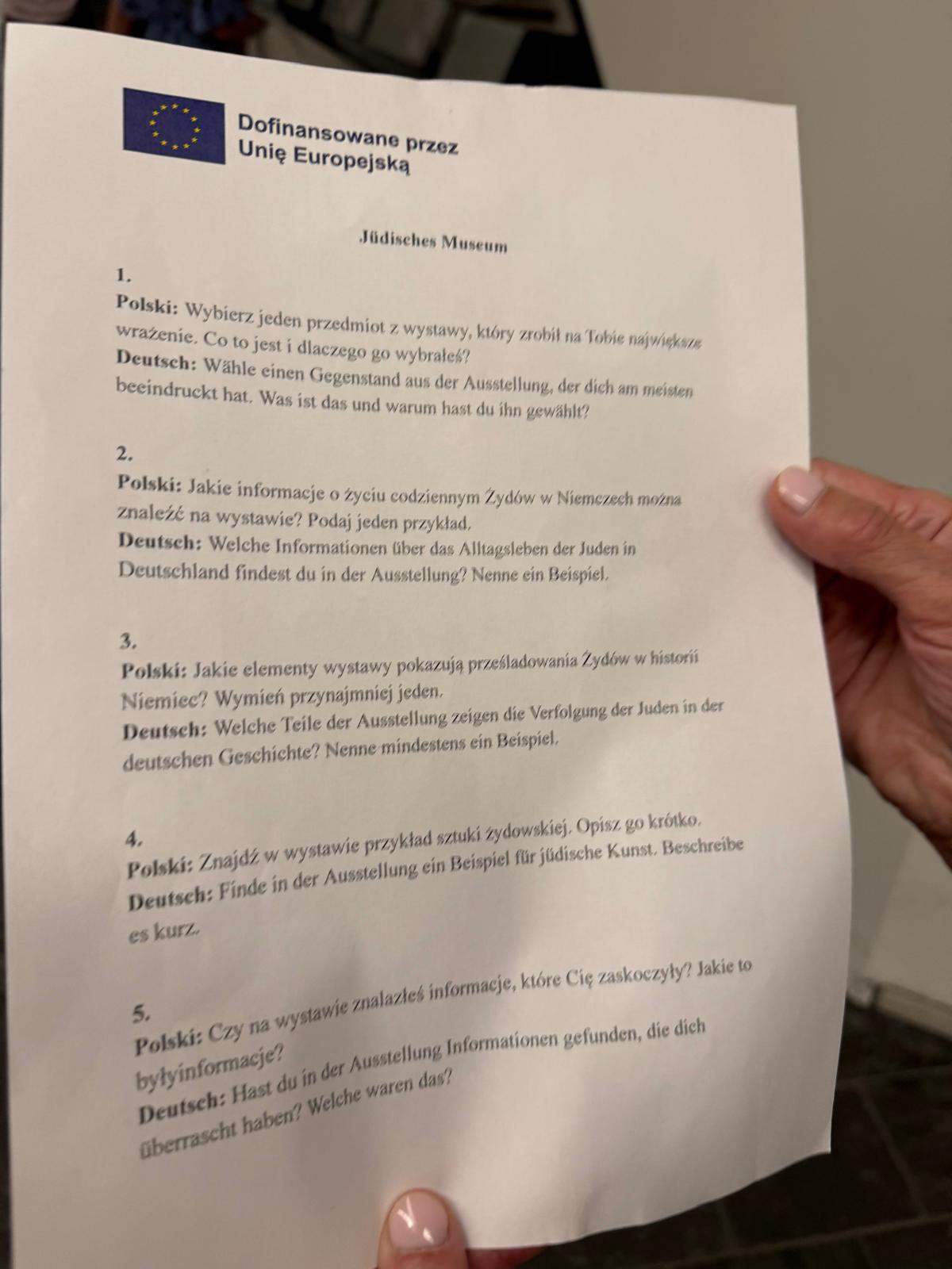 6 dzień edukacyjnej przygody naszych seniorów uczestniczących w projekcie „Odzyskiwanie wspomnień – międzynarodowa mobilność seniorów śladami pamięci” (program Erasmus+, 2025-1-PL01-KA122-ADU-000307088) dobiegł końca. Dzień upłynął nam pod znakiem wyjazdu edukacyjnego do Berlina. Program rozpoczął się o godzinie 10:00 wprowadzeniem pt. „Berlin – miasto pamięci i napięć”, które odbyło się w przestrzeni Pomnika Pomordowanych Żydów Europy. Seniorzy mieli okazję poznać symbolikę tego miejsca, jego znaczenie w kontekście pamięci historycznej oraz współczesnych dyskusji o odpowiedzialności za przeszłość. Następnie, w godzinach 11:15–12:45, grupa udała się do Muzeum Żydowskiego, gdzie uczestnicy zwiedzali wystawy z wykorzystaniem specjalnie przygotowanych kart pracy, co pozwoliło na refleksję nad eksponatami oraz samodzielne poszukiwanie odpowiedzi na pytania związane z historią społeczności żydowskiej w Niemczech.